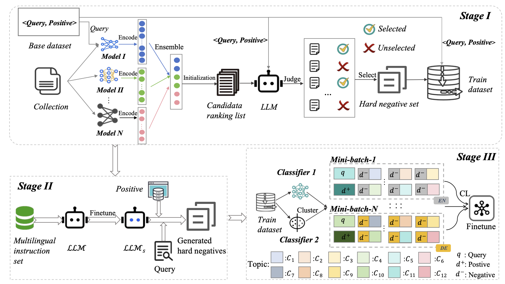 - Hard negative 후보를 retriever 앙상블 + LLM filtering으로 고품질화.