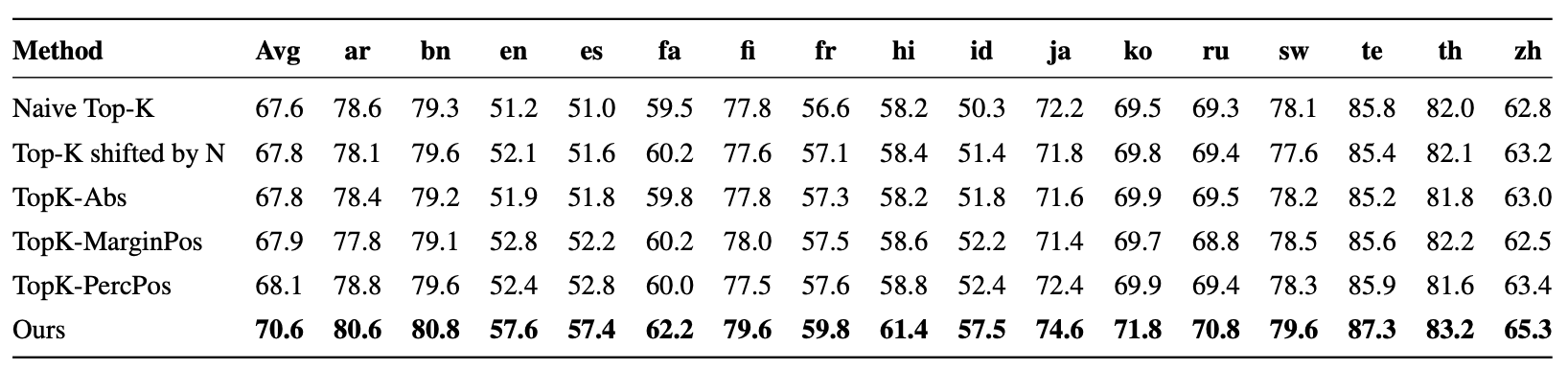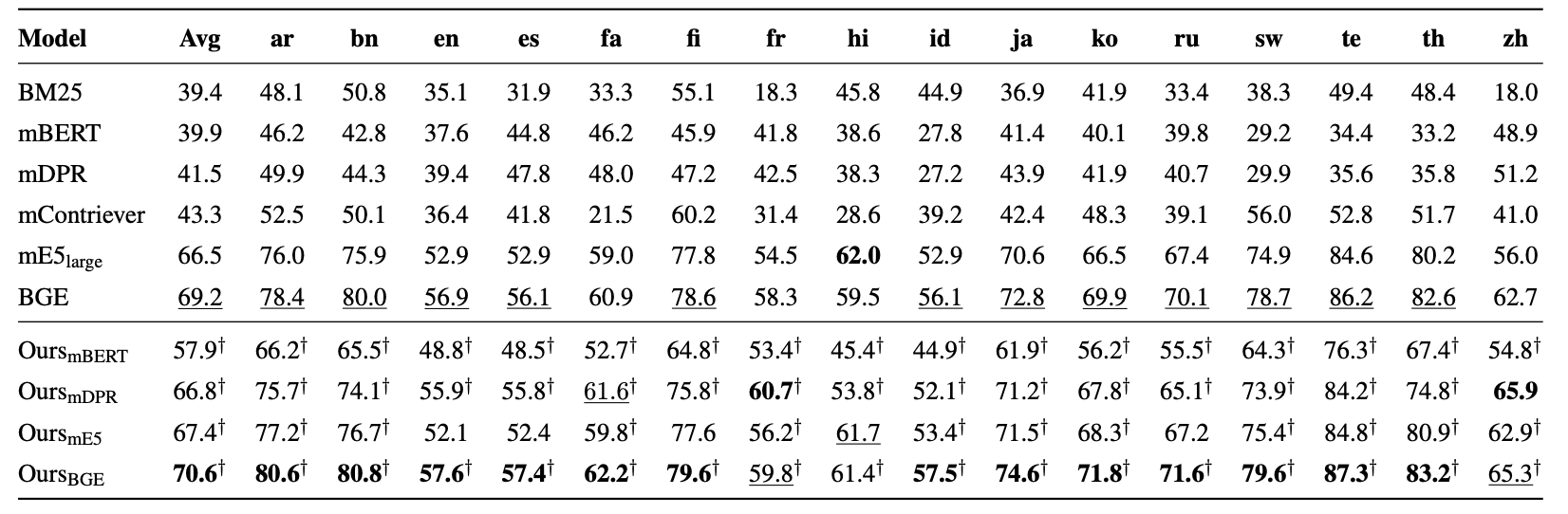 - mBERT, mDPR, mE5, BGE 모든 모델에서 일관된 성능 향상을 보임.