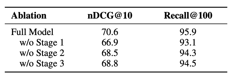 - 세 가지 스테이지 제거 시 성능이 각각 2~4% 감소 → 모든 단계가 성능에 기여함