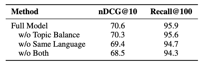 - Mini-batch를 monolingual + multi-topic 구조로 설계하고, 언어·토픽 기반 가중치를 적용.
