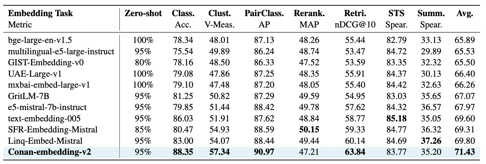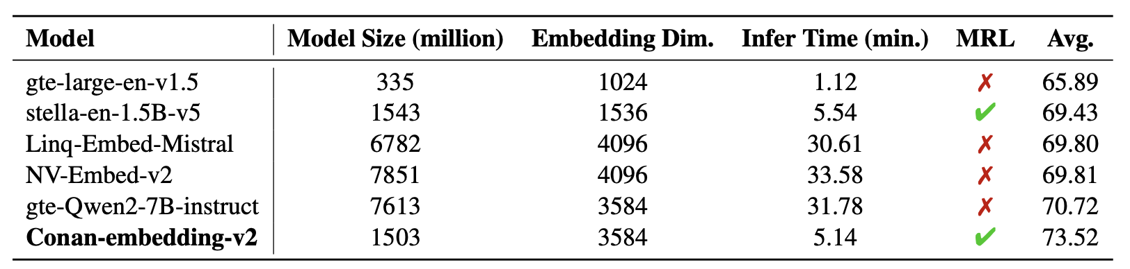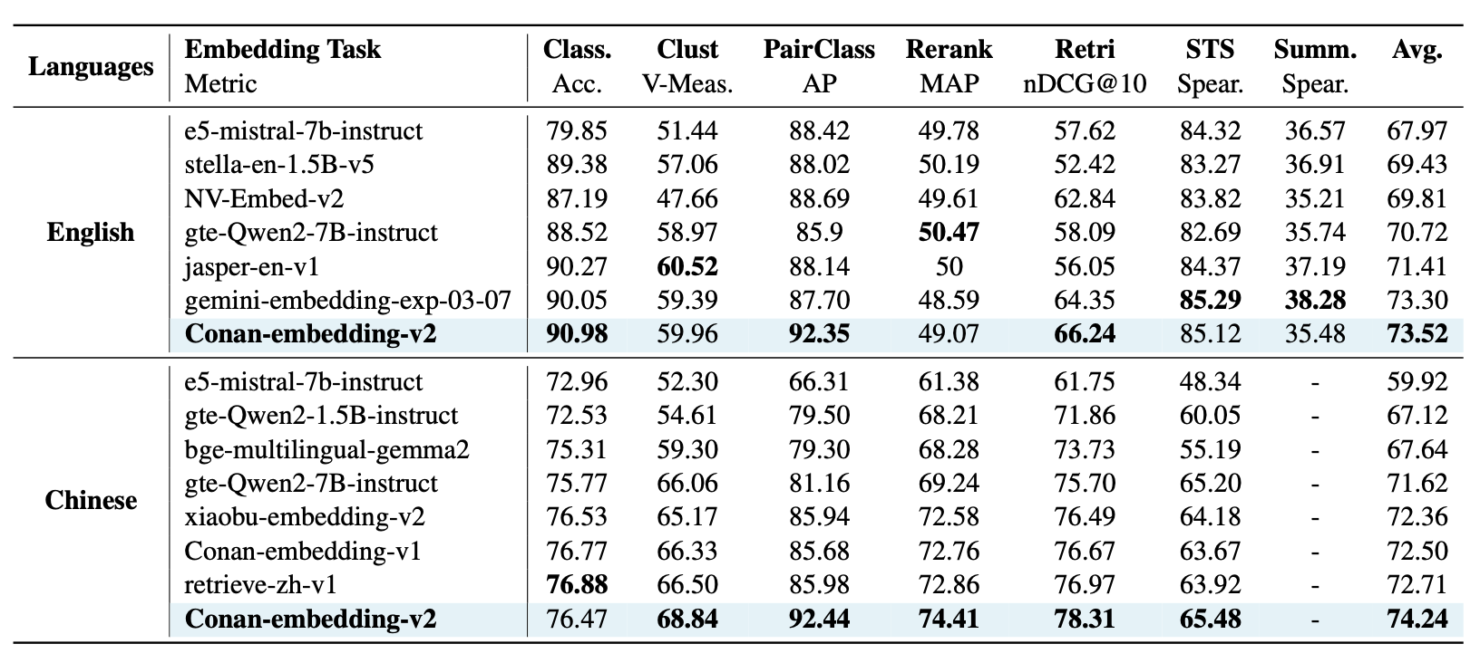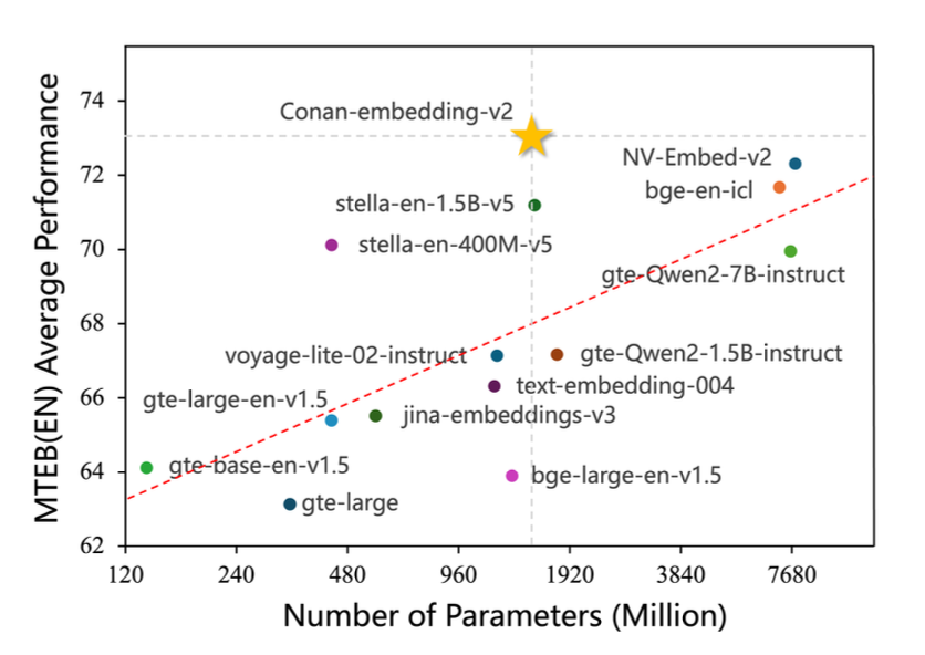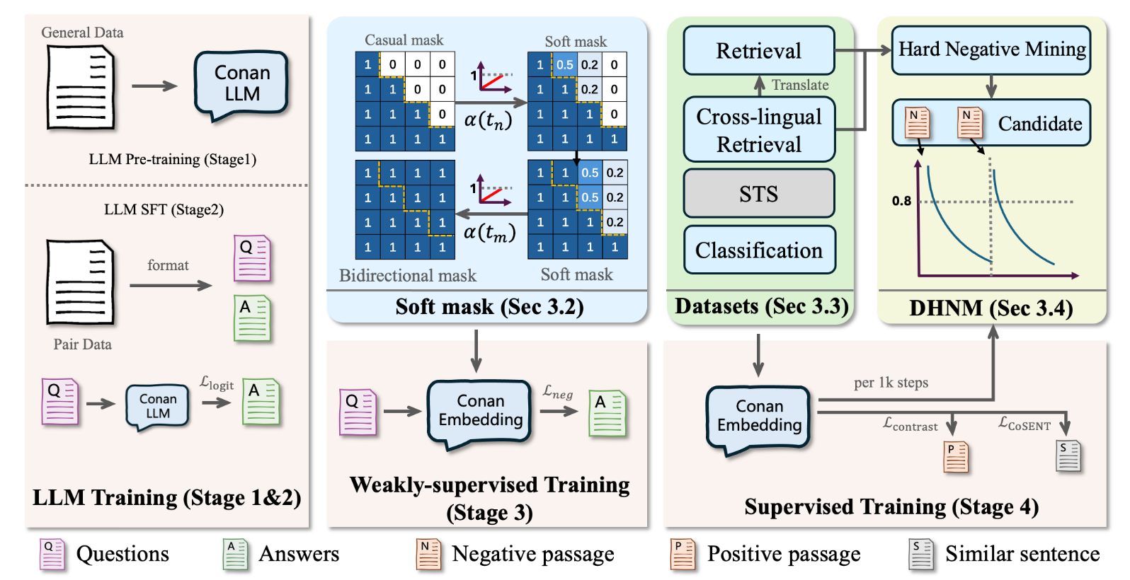 - Conan-embedding-v2는 처음부터 학습한(1.4B 파라미터) LLM을 텍스트 임베딩 전용으로 파인튜닝한 모델임.
