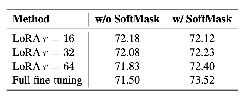 - LoRA도 Soft Mask 적용 시 성능 개선됨