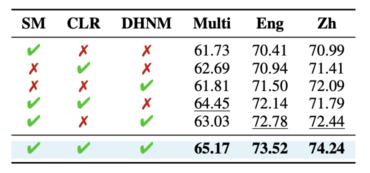 - 훈련 간극 → Soft Mask, Cross-lingual Retrieval, Dynamic Hard Negative Mining 적용