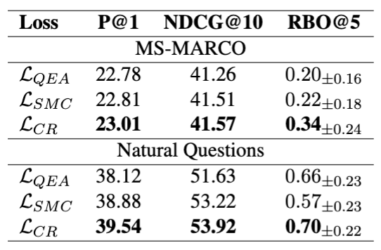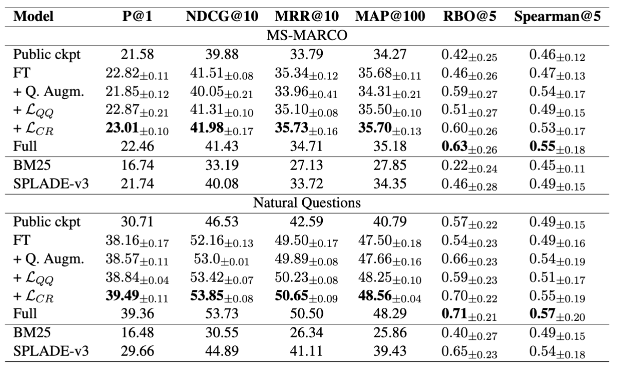 - NQ에서는 정확도와 coherence가 모두 더 크게 개선됨 → 의미 동등 질의 간 top-ranked 문서 겹침이 상당히 증가했음을 의미함