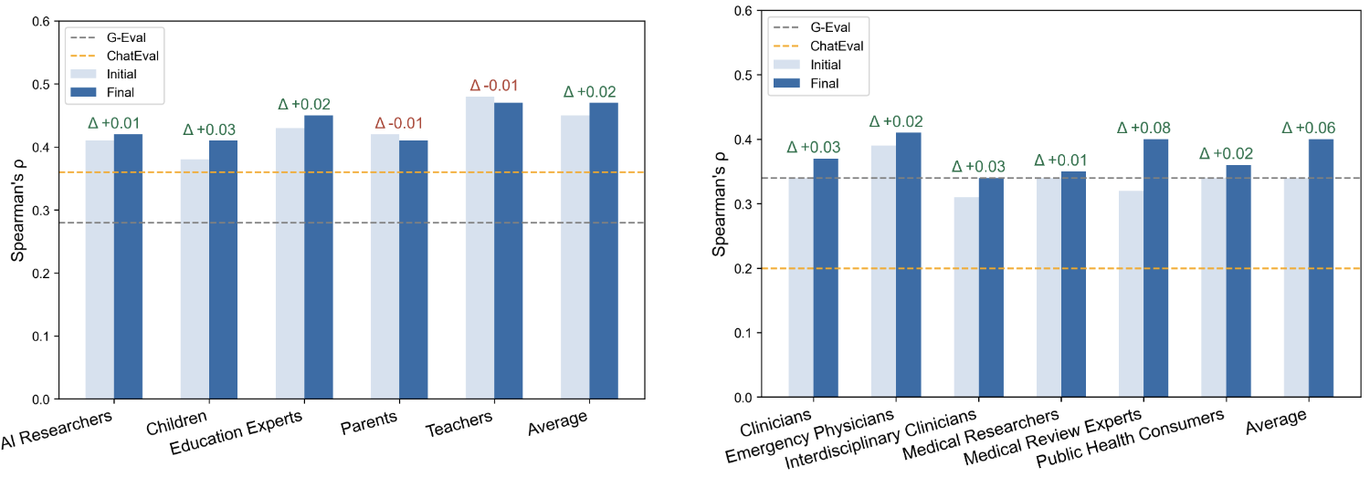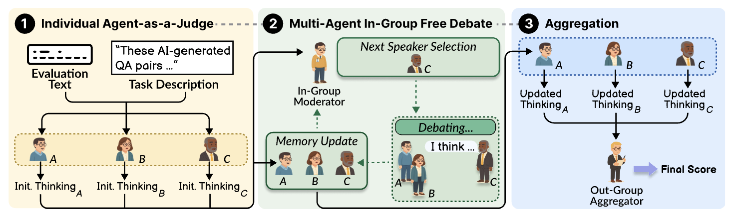 - MAJ-EVAL은 문헌 기반 이해관계자 추출 + 페르소나 생성 + 집단 내 토론 기반 평가를 결합한 Multi-Agent-as-Judge 프레임워크 제안