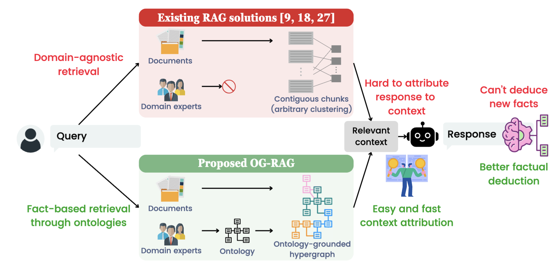 - OG-RAG는 온톨로지 기반 하이퍼그래프를 구축해, LLM이 정확하고 개념적으로 근거 있는 맥락을 활용하도록 함.