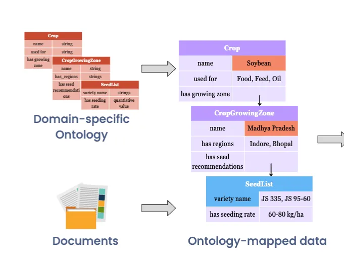 Here is a context definition for wheat crop cultivation ontology. Context Definition: {ontology schema} ––––––––- Generate a JSON-LD using the following data and the above context definition for crop cultivation ontology. Use ‘@graph’ object namespace for the data in JSON-LD. Be comprehensive and make sure to fill all of the data. ...- 온톨로지 구조(개체·속성 정의)를 LLM에 제공하고, LLM이 문서의 텍스트를 읽어서 그 구조에 맞는 JSON-LD 형태의 데이터를 생성.