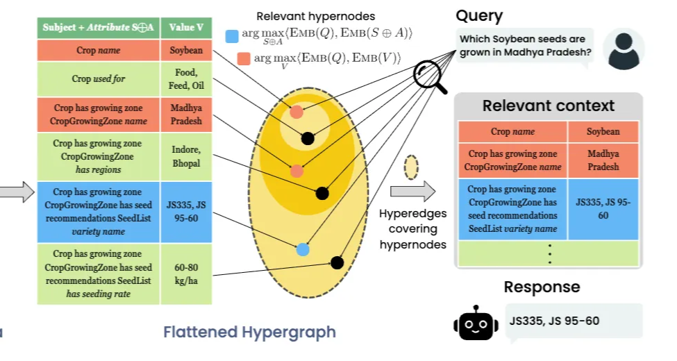 e1 = { (Crop⊕name, Soybean), (Crop⊕growing_zone⊕name, Madhya Pradesh), (Crop⊕growing_zone⊕seed_variety, JS 335), (Crop⊕growing_zone⊕seeding_rate, 60-80 kg/ha) }- 즉, e1이라는 하이퍼엣지는 “Soybean ↔ Madhya Pradesh ↔ JS 335 ↔ 60–80 kg/ha”라는 연결된 사실 집합을 표현.