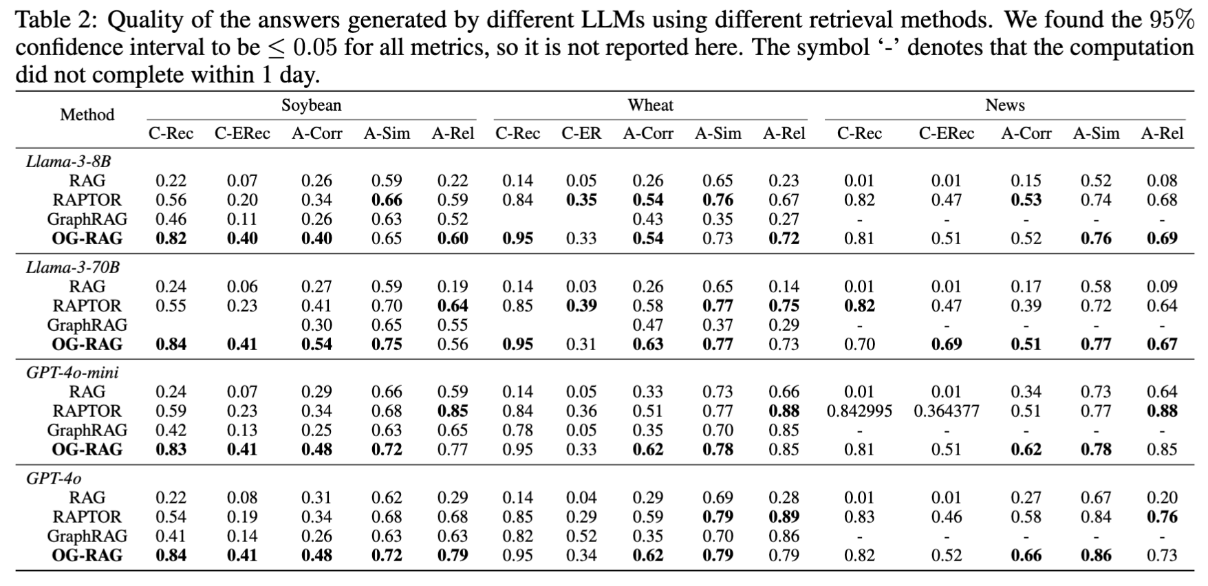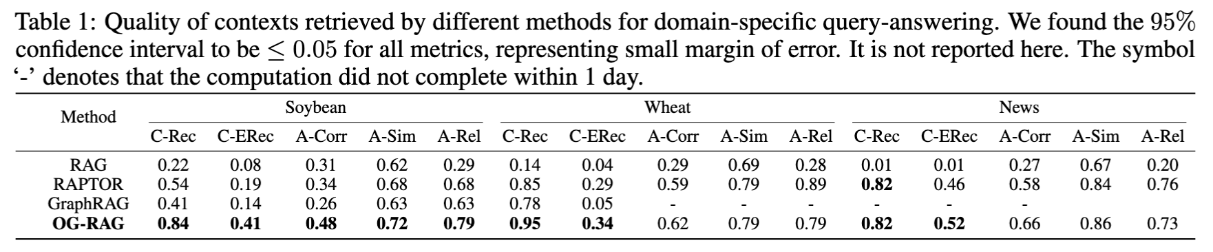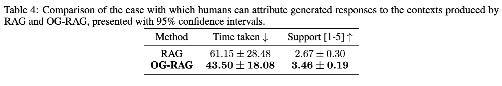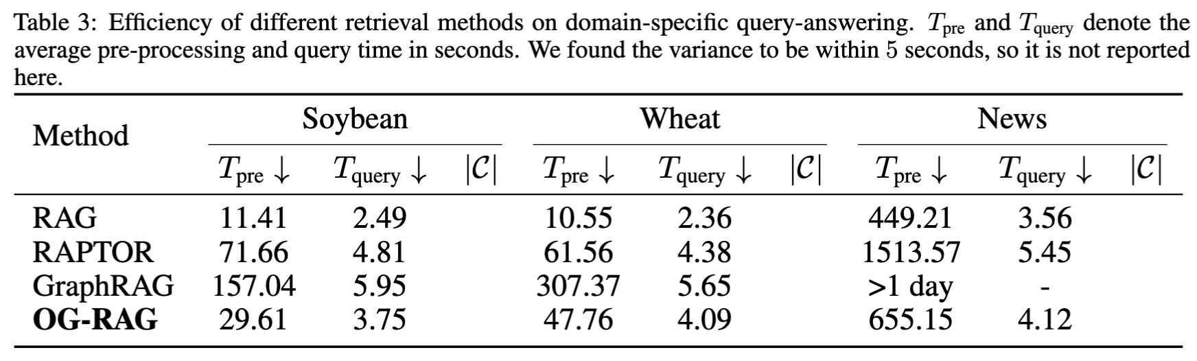 - OG-RAG은 RAG보다 쿼리당 평균 2초 정도만 느림, 그러나 RAPTOR/GraphRAG보다 훨씬 효율적