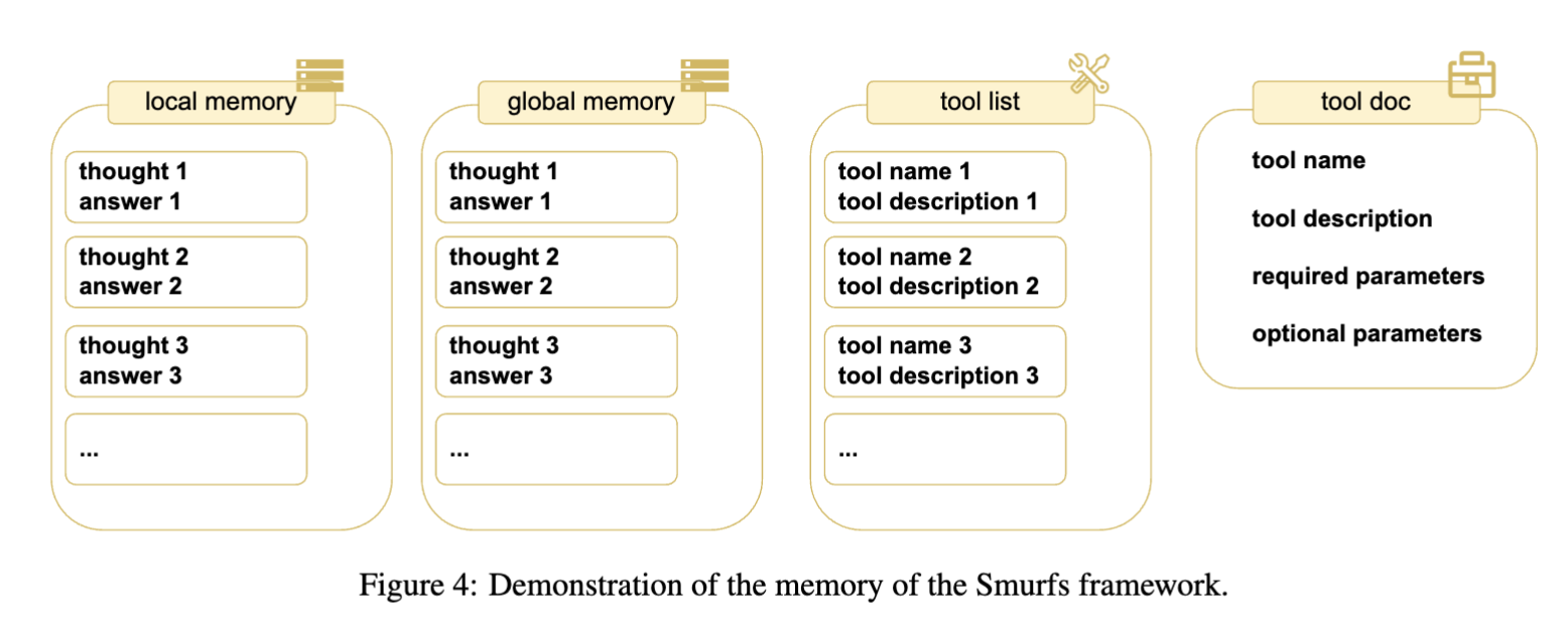 | 메모리 종류 | 역할 | | — | — | | 로컬 메모리 | 현재 해결 중인 서브 문제의 thought-answer 쌍 저장 | | 글로벌 메모리 | 전체 작업 과정 추적, 최대 반복 초과 시 최종 응답 생성에 활용 |
